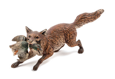 in the form of a fox carrying prey, with impressed GESCHUTZT mark to the underside.