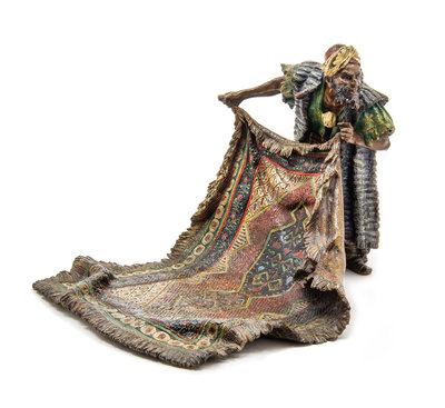 in the form of a rug merchant, the rug and figure with impressed GESCHUTZT and Bergman foundry vase marks.