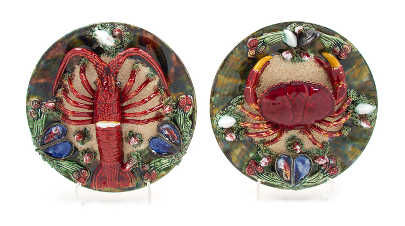 one modeled to show a lobster, the other a crab, each impressed Alvaro Jose/Caldas Da Rainha/Portugal to the underside.