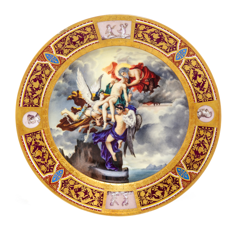 depicting Death and Sleep bringing Jupiter the body of Sarpedon, titled to the underside and with a beehive mark in underglaze blue to the underside.