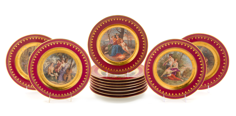 painted to depict various figural scenes within a claret border having gilt highlights, each signed, with a painted beehive mark in underglaze blue and a title to the underside.