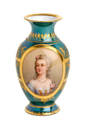 of bud form, the body with an oval cartouche depicting a lady against an emerald ground with gilt highlights, with a beehive mark in underglaze blue and titled illegibly to the underside.