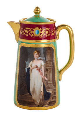having a rectangular reserve depicting a lady and signed Knoitter, against a chartreuse and claret ground with gilt highlights, titled Konigin Luise and with a beehive mark to the underside.