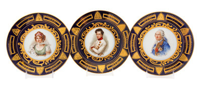 the central reserves depicting Duc de Reichstadt, Louis XVI and Konigin Luise von Preussen, the last example signed illegibly, each against a cobalt ground with gilt highlights, with a transfer-printed beehive mark in underglaze blue to the underside.