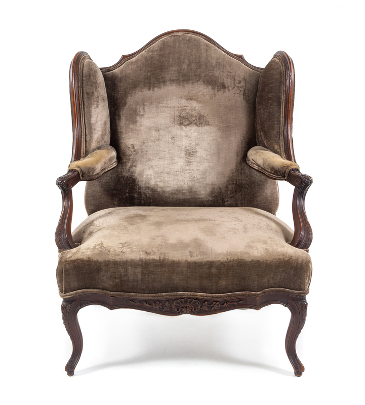 having a padded back and sides, arms and a stuffover seat, raised on cabriole legs.