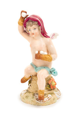 modeled to show Cupid with gloves and snowballs, with crossed T mark in underglaze blue to the underside.