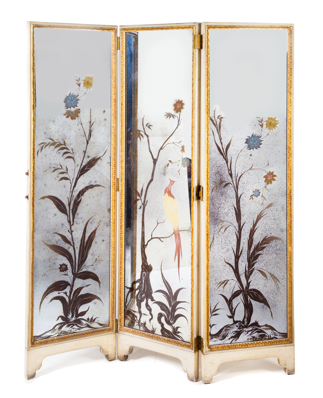A Painted Mirror-Inset Three-Panel Screen