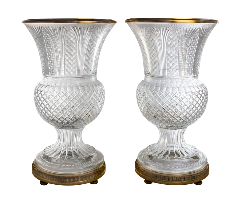 A Pair of Gilt Bronze Mounted Cut Glass Style Urns