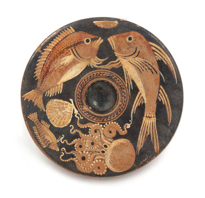 the field decorated to show three fish, an octopus and a scallop enclosing the central garum fish sauce recess within a border of Greek waves, the overhanging rim with a band of Greek waves, raised on a circular foot.
