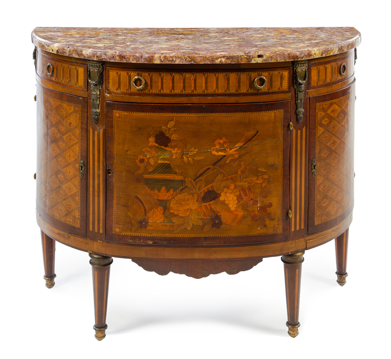 the top of demilune form above the conforming case fitted with three aligned drawers and three cabinet doors, raised on cylindrical tapering legs with blind fluting ending in brass caps, the case inlaid to show an ewer and a fruit basket among flowers and patera.
