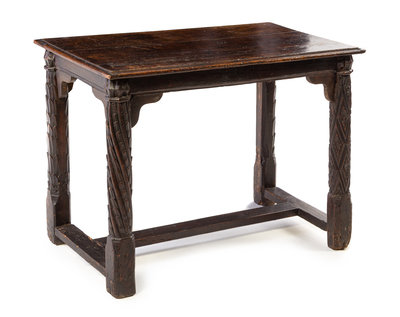 the rectangular top above the molded frieze, raised on foliate carved legs ending in block feet and joined by an H-form stretcher.