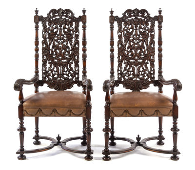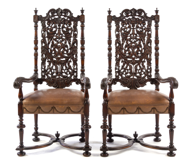 the back heavily pierce carved to show florettes and foliate scrolls above the trapezoidal stuffover seat within acanthus carved downswept arms, raised on ring turned cylindrical legs joined by curved X-form stretchers.