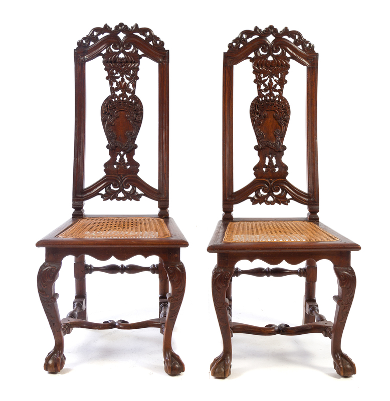 each having a shaped crest rail pierce carved to show foliate scrolls above the pierce carved vasiform splat and caned seat, raised on acanthus capped cabriole legs joined by an H-form stretcher and ending in claw-and-ball feet.