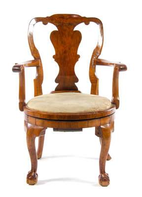 the shaped crest rail above the vasiform splat and circular drop-in seat within open arms, raised on cabriole legs ending in claw-and-ball feet.