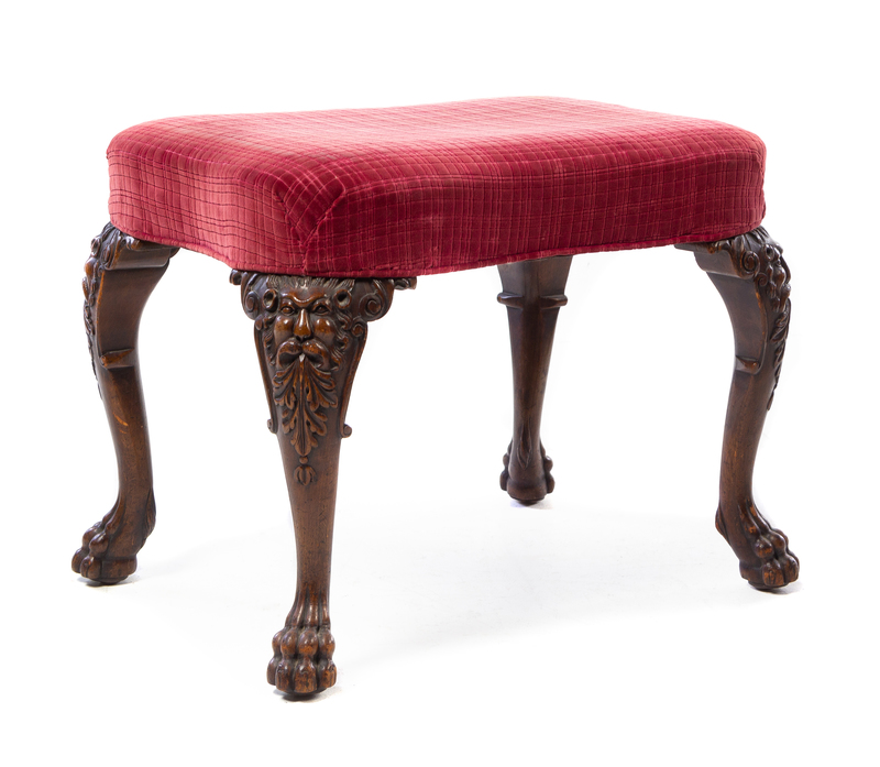 the rectangular upholstered top raised on cabriole legs carved to show grotesque masks at the knees and ending in paw feet.