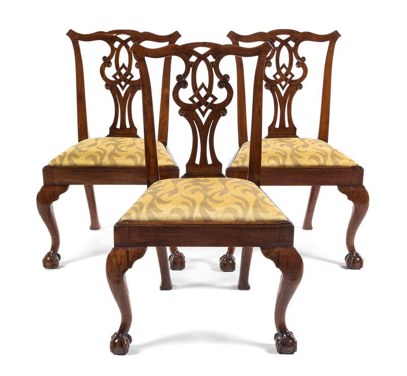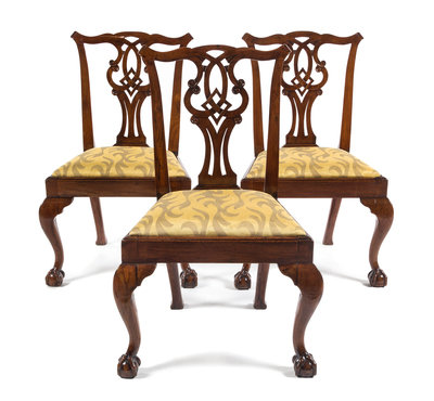 each having a serpentine crest rail above the vasiform splat pierce carved to show volutes and the drop-in cushion seat, raised on cabriole legs ending in claw-and-ball feet.