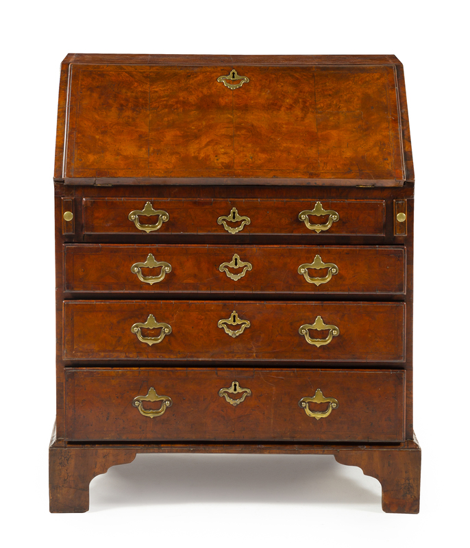 having a rectangular top above the fall-front opening to a fitted interior with a leather inset writing surface, over four graduated long drawers, raised on bracket feet.
