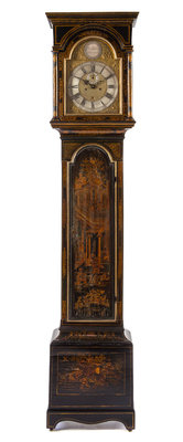 the hood having a molded projecting cornice above the glazed sides and door flanked by columnar supports and opening to a silvered brass dial with Roman numeral hours, Arabic numeral minutes, a seconds dial and a date aperture, signed Robt. Gymer Norwich, the straight trunk fitted with a door, raised on a bracket base.
