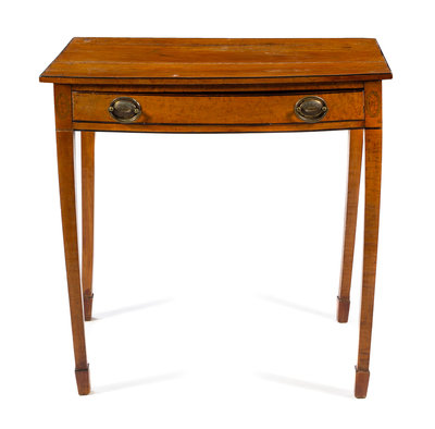 having a bowfront top above the conforming frieze fitted with a single drawer, raised on square tapering legs headed by inlaid shells and ending in spade feet.
