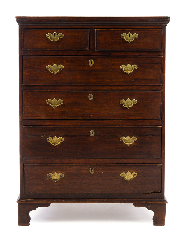 the rectangular top above the case fitted with two short and four graduated long drawers, raised on bracket feet.