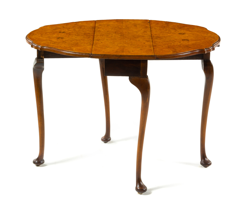 the shaped circular top raised on two swinging and two stationary cabriole legs ending in pad feet.