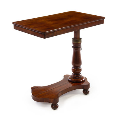 the rectangular top set on an adjustable turned baluster form stand, raised on a shaped base ending in bun feet.