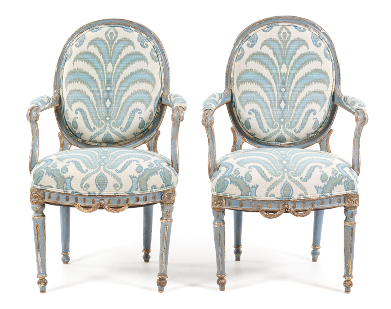 A Pair of Louis XVI Style Painted and Parcel Gilt Fauteuils