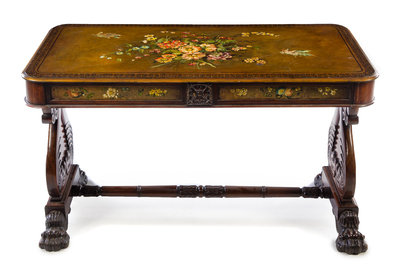 having a rectangular top with rounded corners above the conforming frieze set with opposing drawers, raised on twin supports ending in paw feet and joined by a turned and foliate carved stretcher, painted thoughout to show birds and floral sprays.