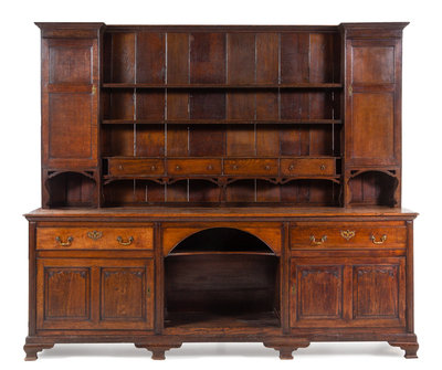 in two parts, the superstructure having a molded projecting cornice above shelves and four aligned drawers flanked on each side by a paneled door above an open niche, the base fitted with an open niche flanked on each side by a drawer and a paneled door.