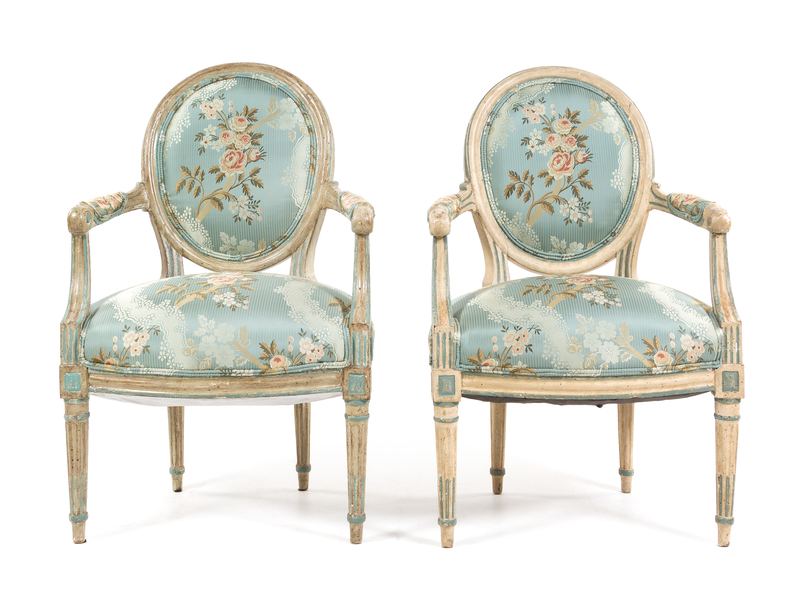 each having an oval padded back, arms and stuffover seat, raised on fluted cylindrical tapering legs.