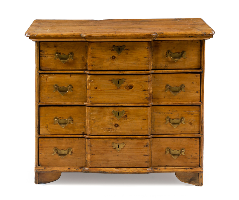 having a shaped rectangular top above the conforming case fitted with four long drawers, raised on bracket feet.