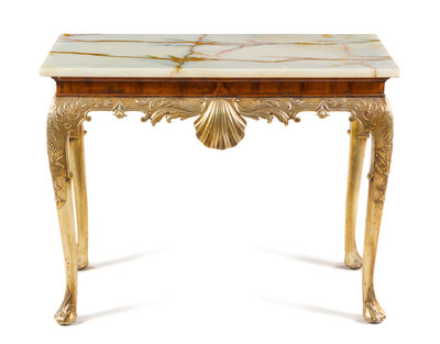 having a rectangular onyx top above the shell decorated frieze, raised on foliate carved cabriole legs.