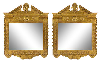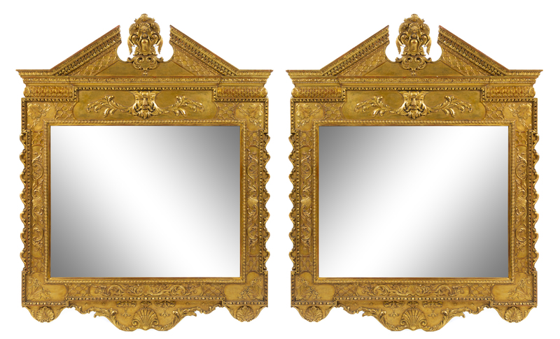 each having a dentiled and foliate carved broken arch pediment above the frieze centered with a grotesque mask and the horizontal rectangular mirror plate.