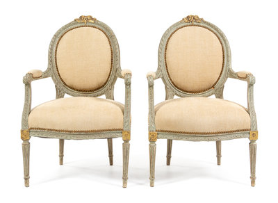 A Pair of Louis XVI Style Painted and Parcel Gilt Fauteuils