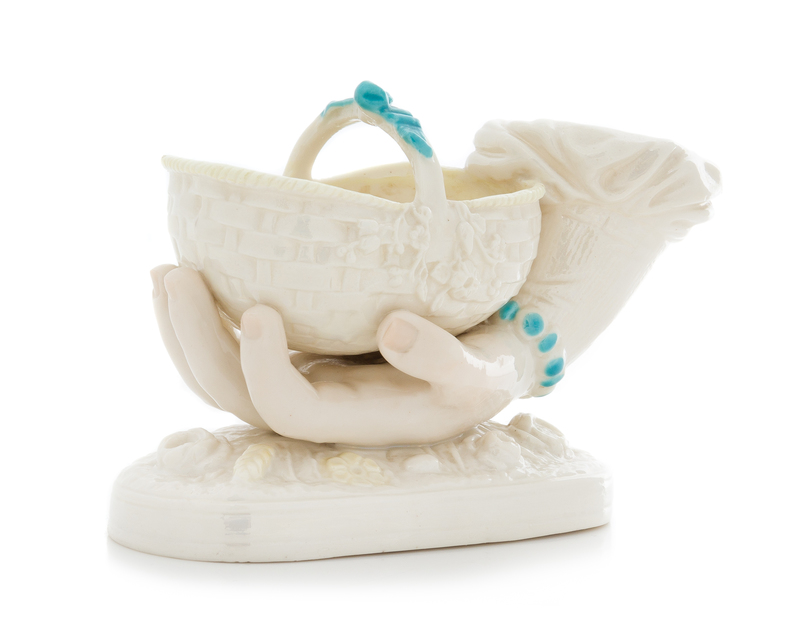 in the form of a braceleted hand holding a basket over a bed of roses.