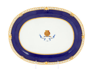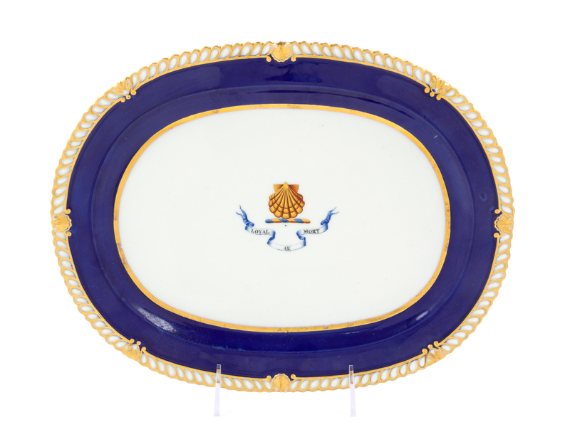 the gadroon rim worked to show rocaille, the blue border centered by a crest of an escallop surmounting the motto Loyal au Mort.