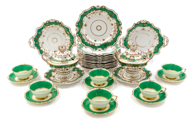 comprising two sauce tureens, two trays and twelve plates, together with six associated teacups and eight saucers; 30 items total.