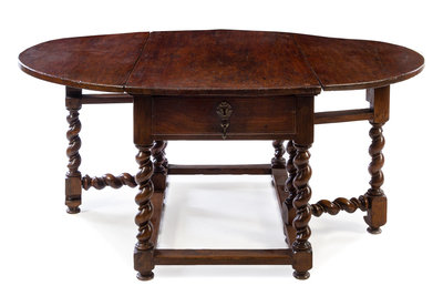 the rectangular top with rounded ends and two D-shaped leaves opening to oval, above two opposing drawers raised on twist carved legs joined by box stretchers.