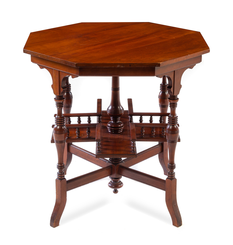 the top of octagonal form, set on ring turned cylindrical supports joined by an X-form stretcher.