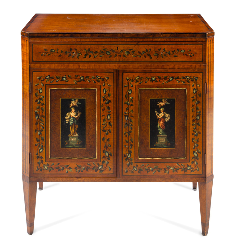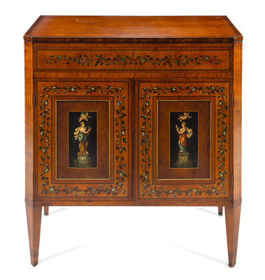 having a rectangular top with canted corners above the conforming case fitted with a long drawer above two paneled doors opening to an interior fitted for shelves, the doors painted to depict classical maidens and cherubs among flowering vines, raised on square tapering legs.