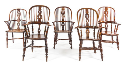 An Assembled Set of Five Elm and Yew Windsor Chairs