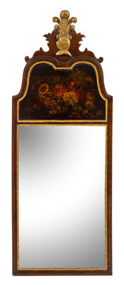 the shaped crest centered with a knight's helmet with plumage above a shaped cartouche decorated with a floral spray and the vertical rectangular mirror plate.