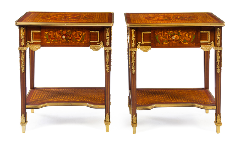A Pair of Louis XVI Style Gilt Bronze Mounted Side Tables