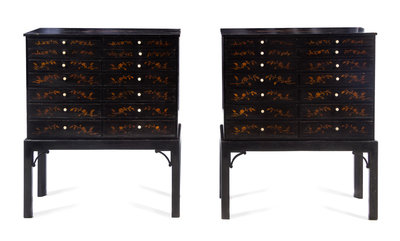 each having a rectangular top above fourteen graduated drawers with bird and foliate decoration, raised on later stands.