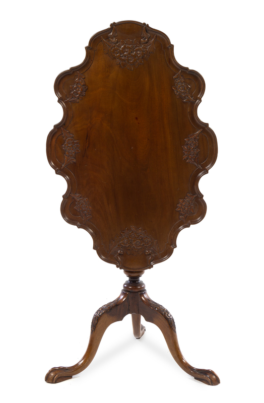 the elongated top of serpentine outline carved to show floral sprays above the turned standard, raised on a foliate carved tripod base ending in claw and ball feet.