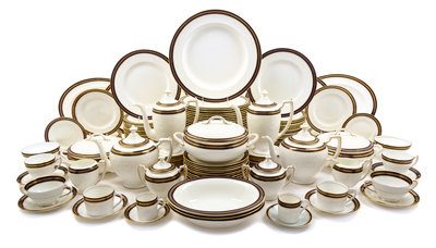 Blue Wheat pattern, comprising: 77 dinner plates, 60 salad plates, 49 bread plates, 40 dessert fruit bowls, 24 8-inch soup bowls, 19 9-inch soup bowls, 62 coffee cups and saucers, 21 teacups, 16 cream soup bowls, 13 5 3/4-inch saucers, 11 6-inch saucers, 4 6 1/4-inch saucers, 6 espresso cups and saucers, 5 15-inch oval serving platters, 3 14-inch oval serving platters, 3 covered vegetable servers, 3 serving bowls, 3 coffee pots, 2 teapots, 2 covered sugars, 2 creamers, 2 master salts, 2 cranberry bowls, 2 dessert sauce bowls, 2 luncheon plates, 1 13 3/4-inch circular dish, 1 sauce boat, 1 square cake dish, 1 butter pad.437 items total