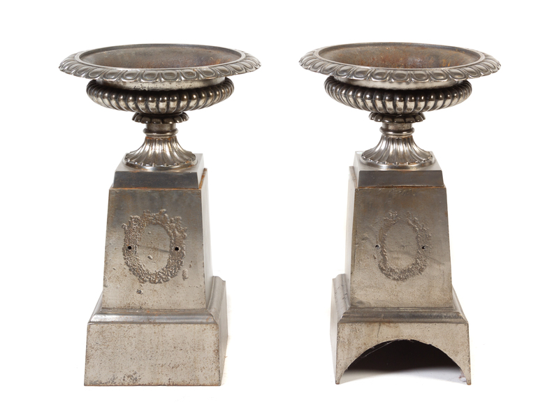 each having a ribbed body and circular foot, raised on a square tapering plinth.