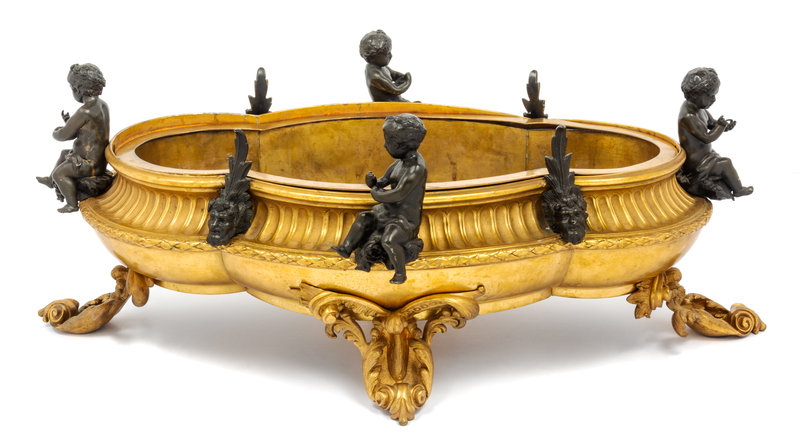 of lobed form, the fluted body mounted with four putti spaced with grotesque male masks, raised on foliate scroll feet, the conforming liner stamped 200/ A. Frenais for Armand Frenais, Paris.
