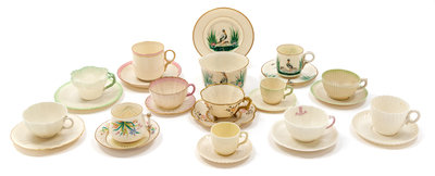 in various patterns, one set with a matching plate, another with a matching plate and bowl, together with a Belleek Collectors Society cup and saucer set; 27 items total.