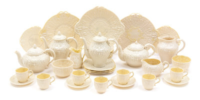 comprising 2teapots, 2 coffee pots, a milk, a creamer, a ewer, 2 bowls, 7 cups, 4 saucers, 11 plates and 3 trays; 34 items total.
